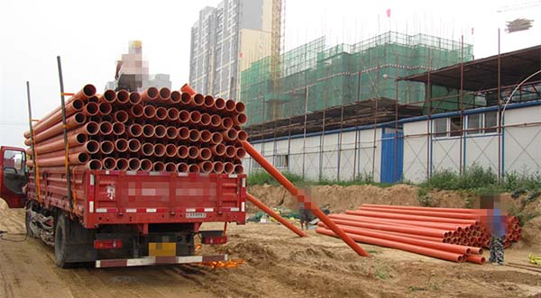 金绿建厂家供货CPVC电力管、热浸塑钢管、玻璃钢管到工地:
